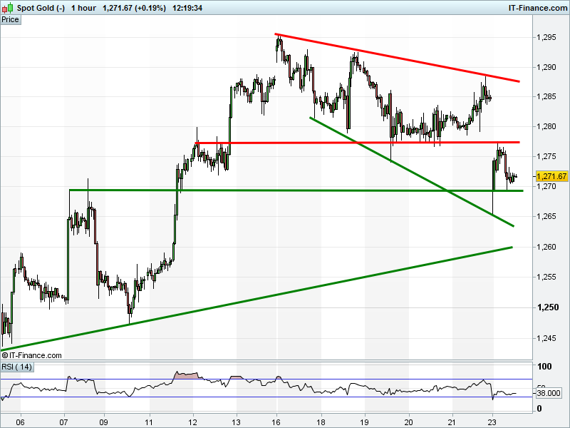Gold is back around $1270 amid revived risk appetite and thus reduced risk aversion. The gap down overnight keeps it in a downtrend since recent highs.