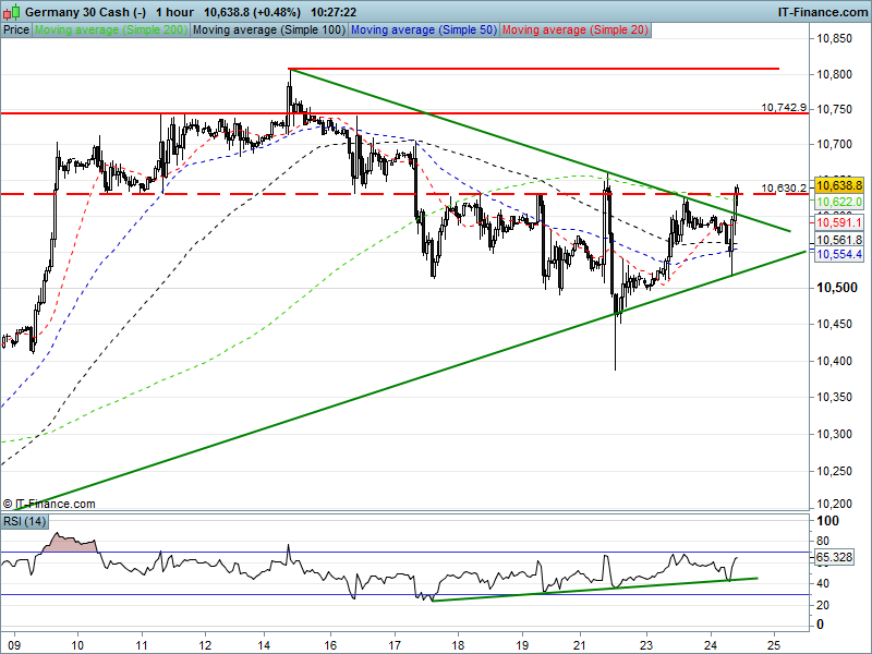 The DAX 30 is at resistance around 10630, but could confirm the 200-hour moving average as support in due course which may see the idnex back in the range it had between 9 and 17 August.