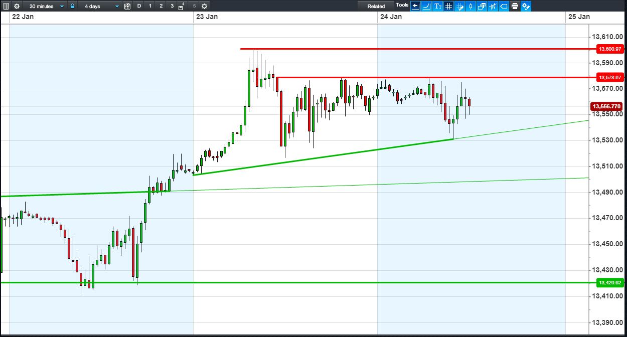 The DAX 30 trades sideways around 13560. Bullish ascending triangle?