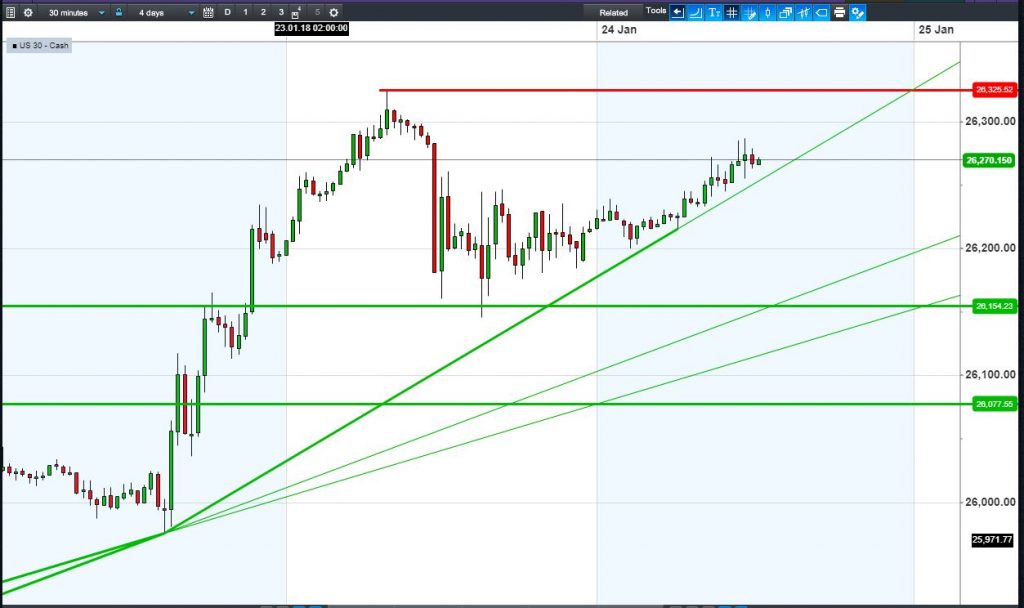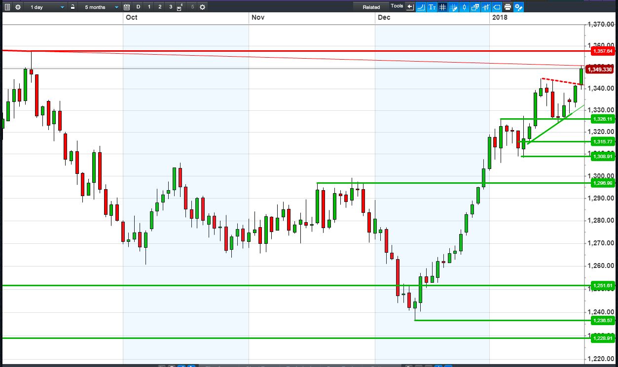 The UK Index 100 has broken below this morning’s 7720 bearish watch level. The DAX 30 trades sideways around 13560. Dow Jones Futures continue to climb back towards 26300. Gold’s $1345 breakout has been slowed by 4.5yr falling highs resistance at $1350.