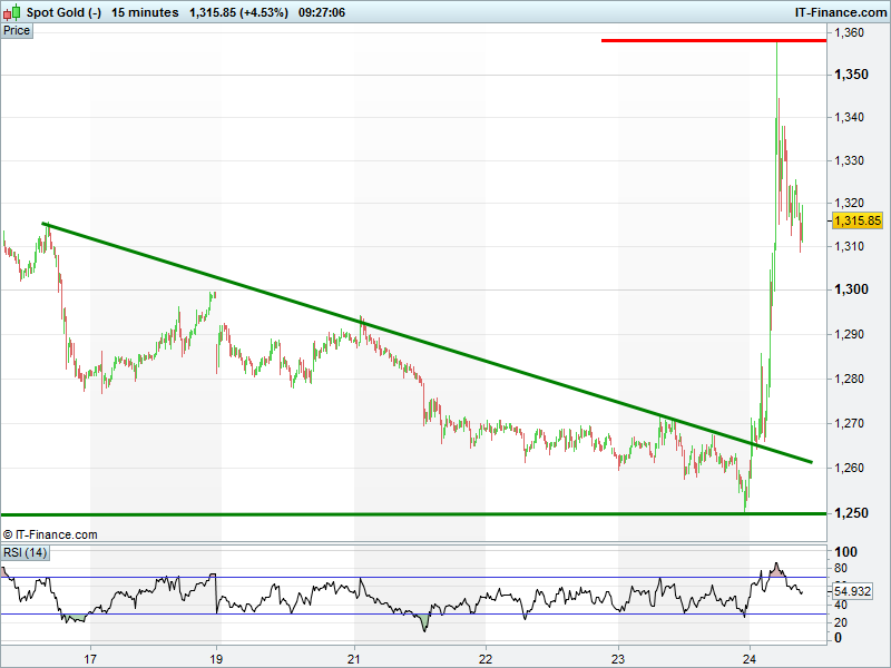Gold popped to $1350 on the Brexit vote but is already back below $1320 as equities rebound and safe haven demand eases.