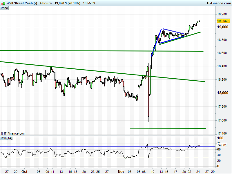 The Dow Jones Futures at 19100 remain around all-time highs with the compass still pointing north. As we said yesterday, a bullish pennant could yet take the index to 19300. RSI says overbought.