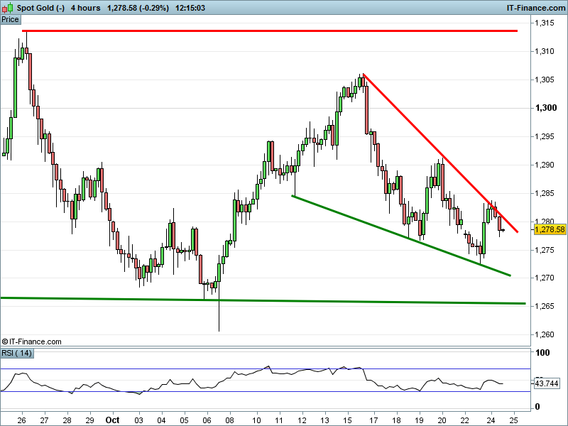 Gold is retreating from falling highs resistance at $1284 after an earlier test of the key level. Note, RSI stuck below 50 = bearish