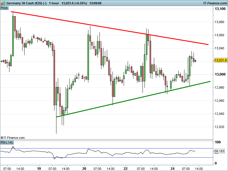 The DAX 30 continues to narrow between 12980-13050 having rallied from rising lows support this morning.