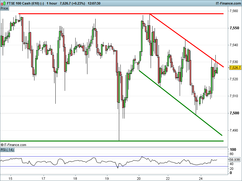 The UK Index 100 is testing the ceiling of a short-term falling 7500-7530 channel.