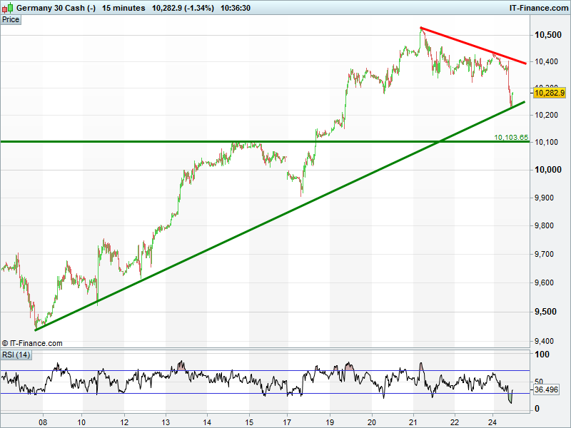 The DAX has managed to engineer a bounce off 10230 to keep April’s uptrend alive. Can it get back above 10300? The Fed uptrend intact until any breach of 9800.