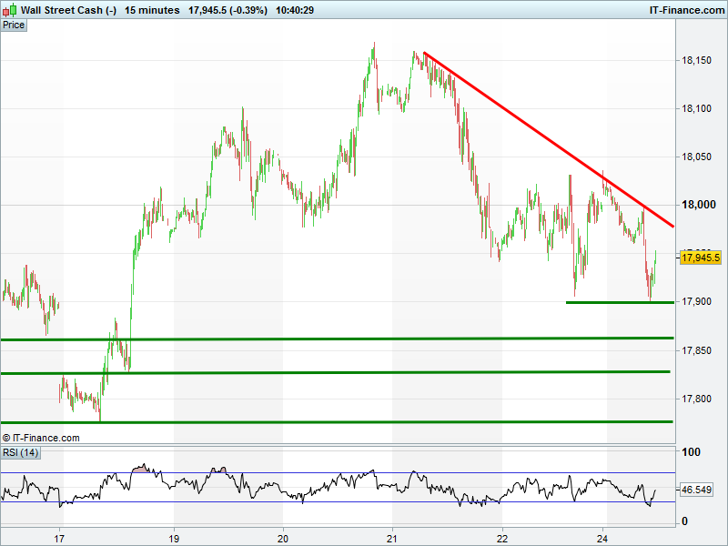 The Dow Jones could be on for a bullish double-bottom if it can get back to 18000 and break the trend of falling highs from last week. Bears must live with likely support at each of the pause levels we had on the way up in April.