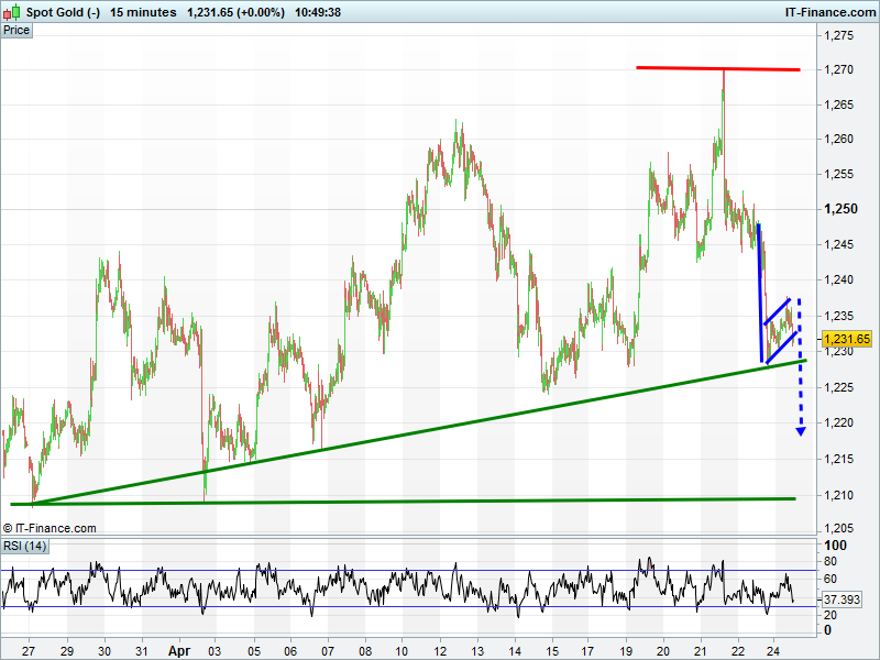 Gold broke below $1245 via the bearish 4-day Head & Shoulders top pattern w highlighted on Friday. Could a bearish flag pattern seal its completion down to $1217 and break the April uptrend?