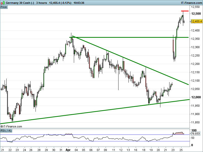 The UK Index 100 rally has slowed upon reaching intersecting resistance at 7285. The DAX 30 has fallen from yesterday’s fresh all-time high, however remains supported above 12,400. Dow Jones Futures are narrowing around 20,800 ahead of today’s Q1 earnings barrage. Gold has fallen from overnight highs of $1278 to $1270 support as risk appetite continues to build.