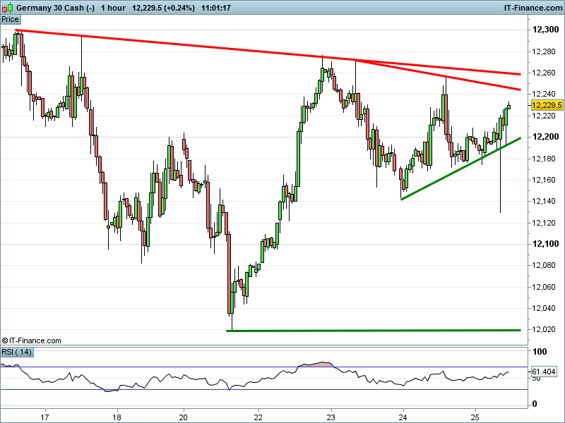 The DAX 30 rally from 12,200 rising lows support is accelerating.
