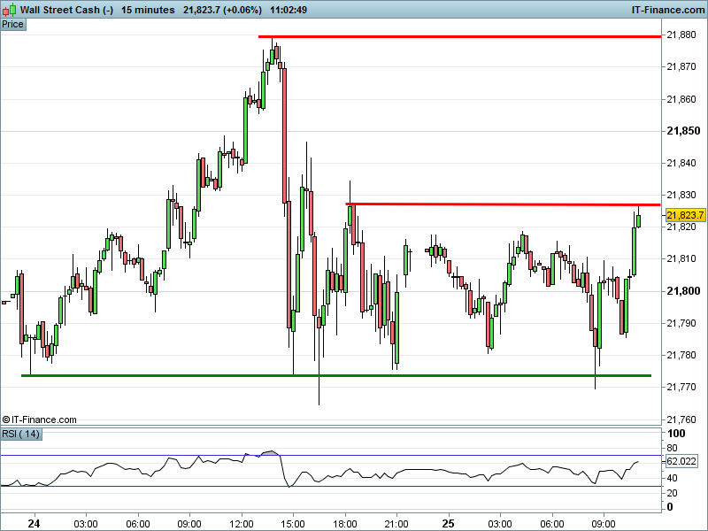 Dow Jones Futures have been trading in a tight 21,775-21825 range overnight. Will they break out from the ceiling or fall towards the channel floor?