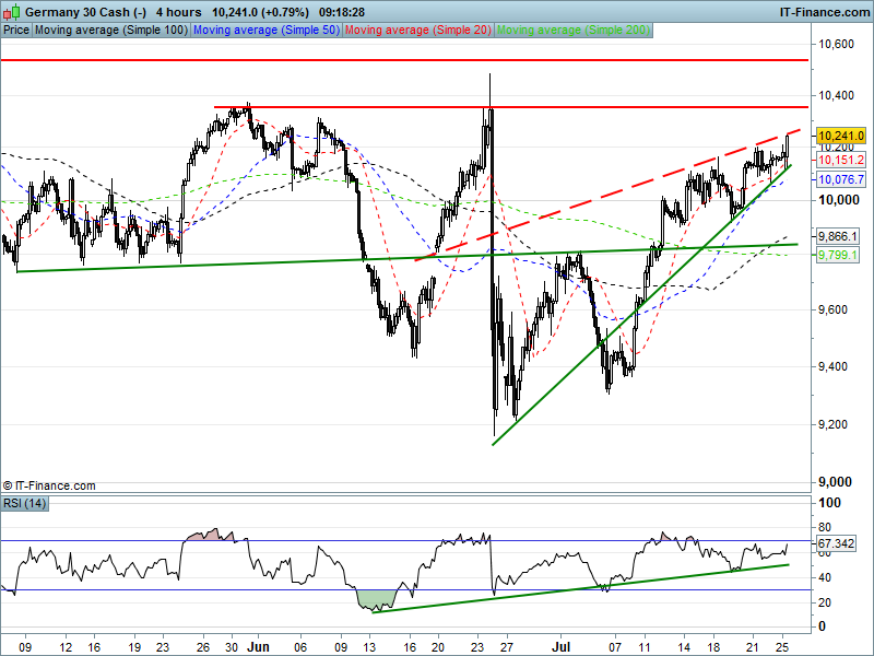 The DAX30 is  making encouraging progress  to test the ceiling of its rising wedge, supported by the 20-period moving average. RSI not yet overbought.
