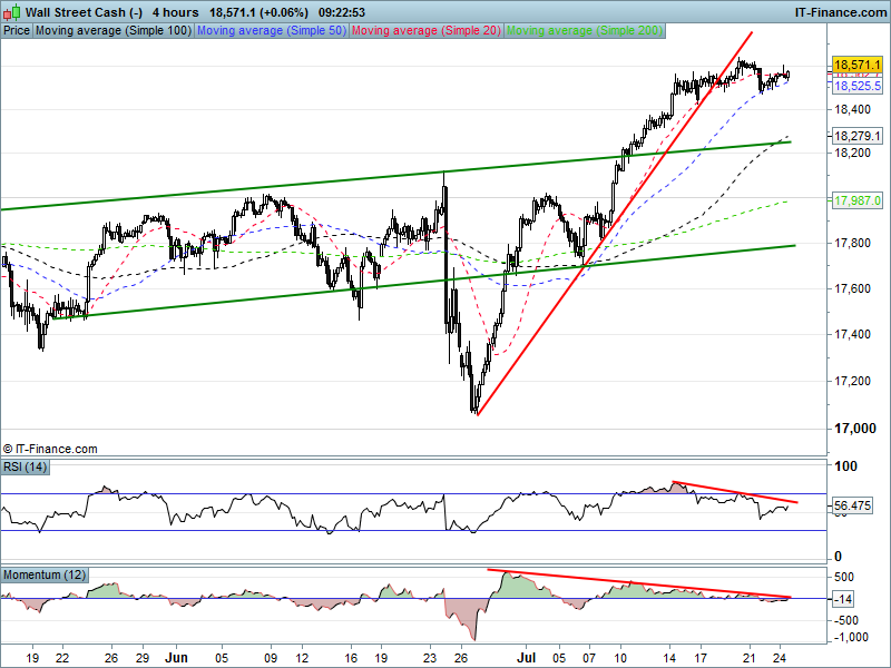 Wall Street/Dow Jones futures  remain near their all-time highs with  RSI and Momentum diverging bearishly with the price, the latter having dipped negative while the former managing to stay just north of neutral. Note also a narrowing pattern bounded by the 50-and 20-period moving averages.