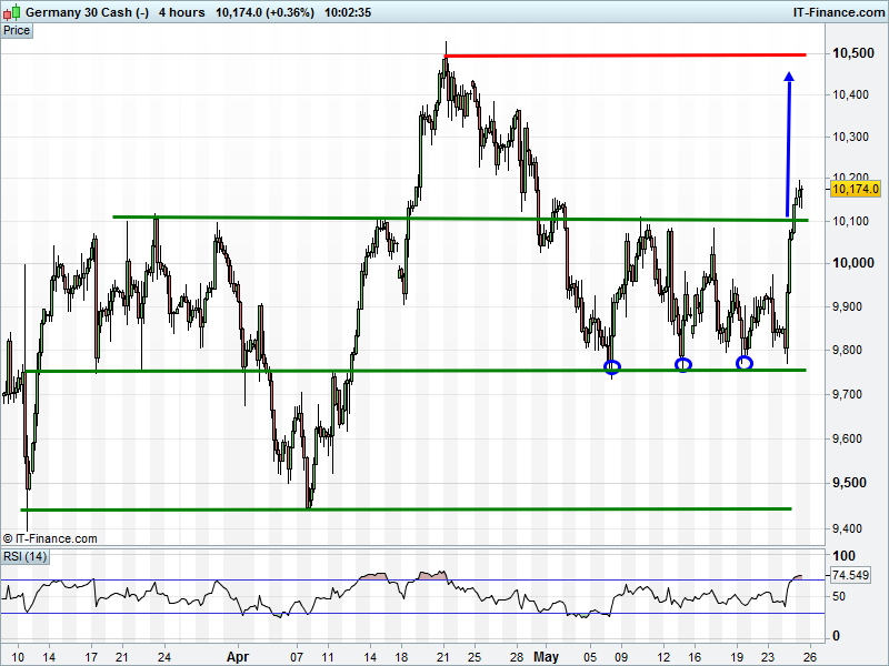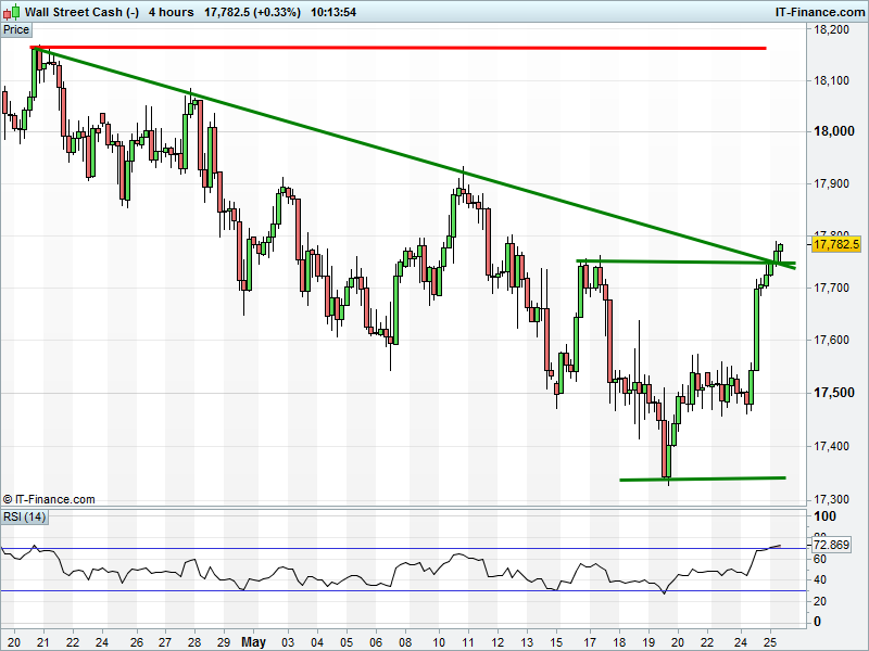 Dow Jones futures have broken beyond April falling highs at 17750 which opens the door to a rally back to 2016 highs of 18150. Note the break at 17750 coincides with completing an inverse head & shoulders reversal from May lows.