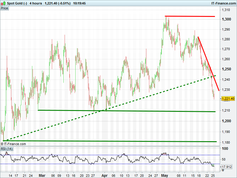 The UK 100 is digesting yesterday’s sharp gains, but support already formed at 6245 for any extension north. The DAX30 is testing 10200 following its breakout at 10100. Triple bottom like the UK Index ? Wall Street/Dow Jones futures have broken beyond April falling highs at 17750, opening the door for a bullish run back to 2016 highs of 18150. Gold continues to sell-off after breaking below 3-month rising support, hindered by a strong USD and appetite for risk assets over safehavens.