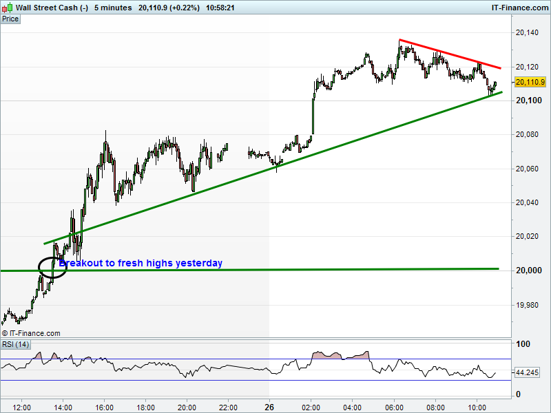 Dow Jones Futures have pulled back towards 20100 where they have found rising support since yesterday afternoon’s 20K breakout.