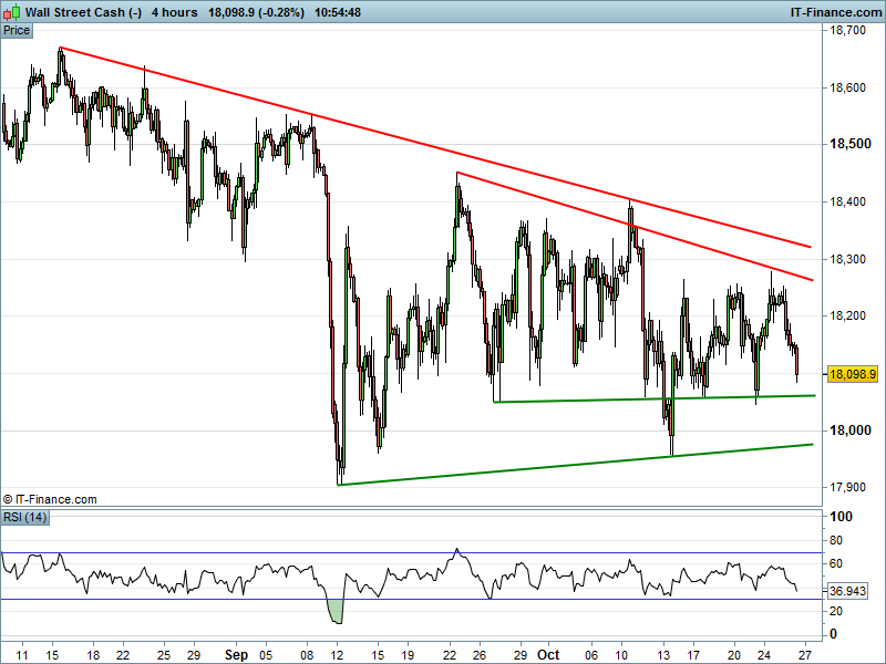 Dow Jones Futures complete the pessimistic outlook for equities as Apple records its first negative annual revenue growth since 2001, sending the index to the bottom of a one month narrowing pattern channel, whilst also testing 2-week rising lows support at 18085.