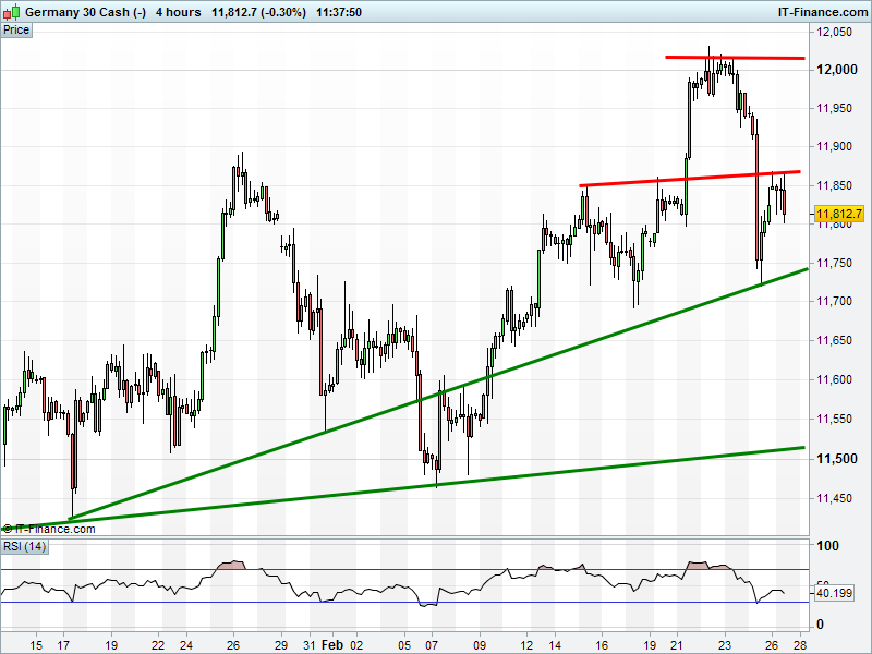 The DAX 30 has found resistance at 11850 but remains in its Feb uptrend