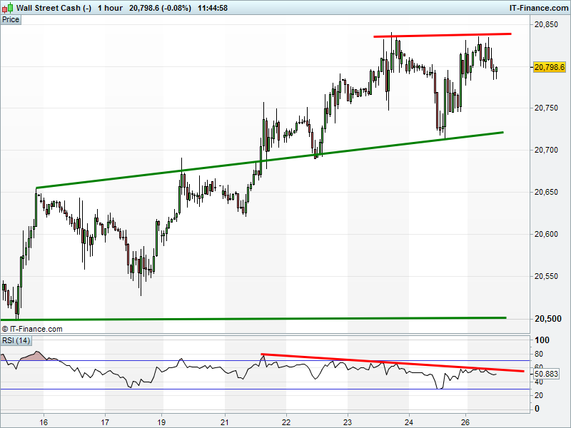 Dow Jones Futures have retreated from record highs to trade back below 20800. Note the RSI’s negative divergence with the price. Warning?