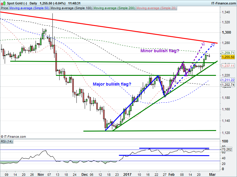 Gold is taking a breather after reaching its 200-day moving average, but bullish flags towards $1280 still valid. In fact, has another mini flag formed over the last 4 days? RSI remains bullish in upper half of range