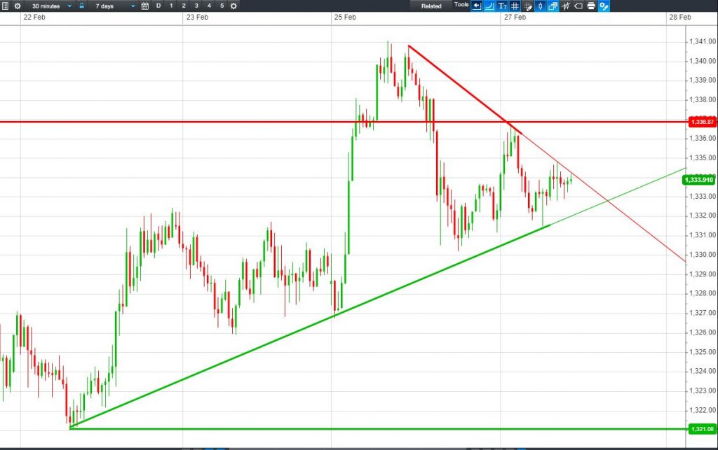 Gold continues to narrow $1331-1334. Break down to $1320 or break out to $1341?