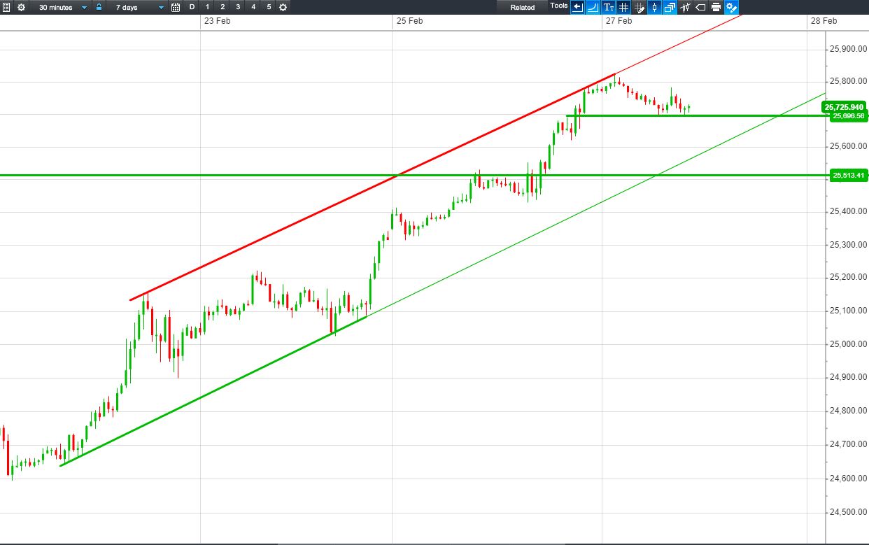 The UK Index 100 is back at 7300 rising lows support. The DAX 30 is retreating from 12600 resistance but remains in uptrend. Dow Jones Futures have found support at 25700, maintaining their rising channel. Gold continues to narrow $1331-1334.