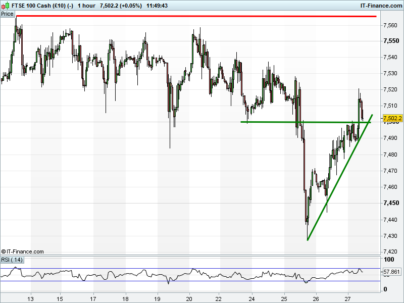 The UK Index 100 holds above its 7500 breakout, helped by GBP weakness resulting from USD strength, itself derived from EUR weakness.