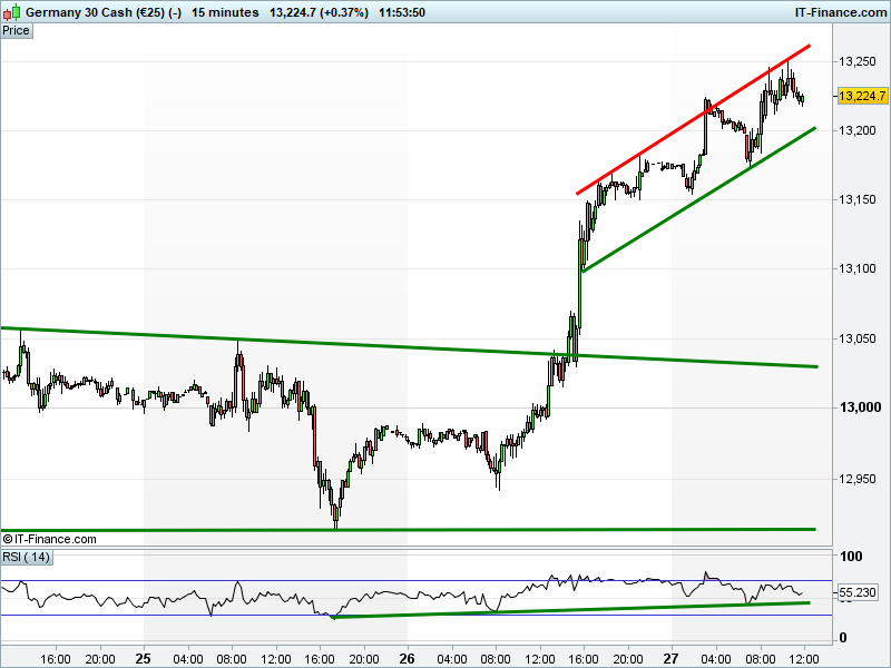 The DAX 30 trades back a shade from 13251 fresh record highs, helped by weaker EUR