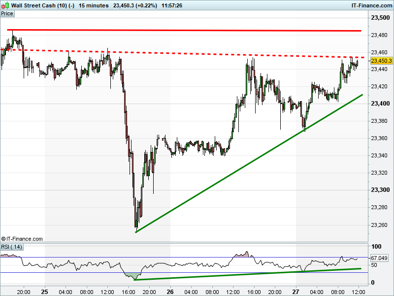 The UK Index 100 holds above its 7500 breakout. The DAX 30 trades back a shade from 13251 fresh record highs. The Dow Jones Futures is flirting with a 23450 breakout to re-test record highs. Gold has found twin support at $1265.