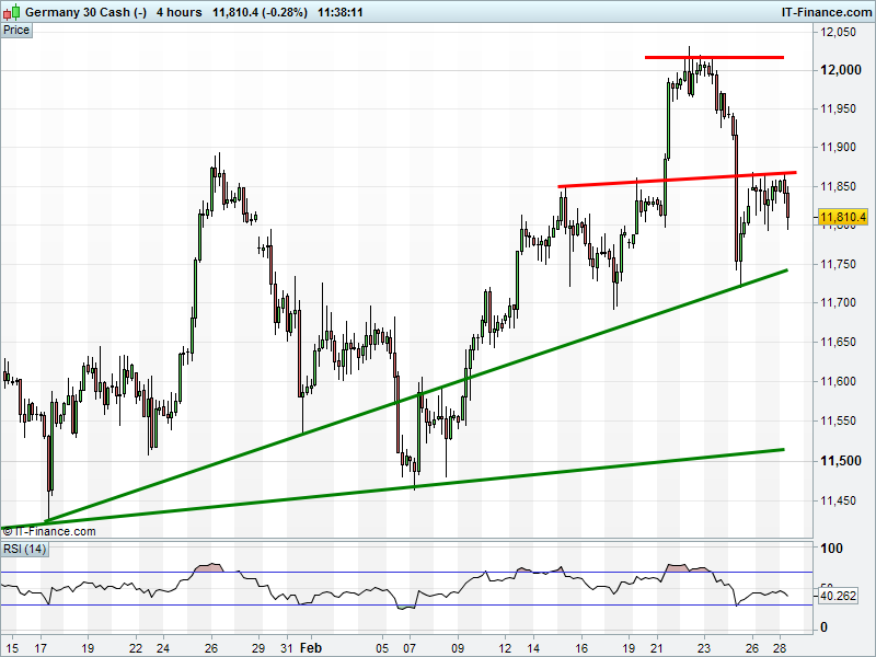 The DAX 30 has again found resistance at 11860 but remains in its Feb uptrend.