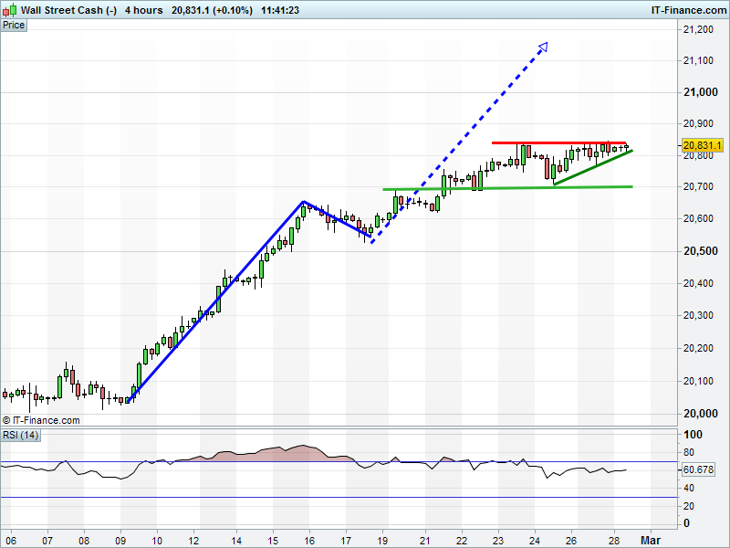 Dow Jones Futures are in a bullish ascending triangle at 20830, awaiting a breakout trigger to complete a 3-week bullish flag from 20,000