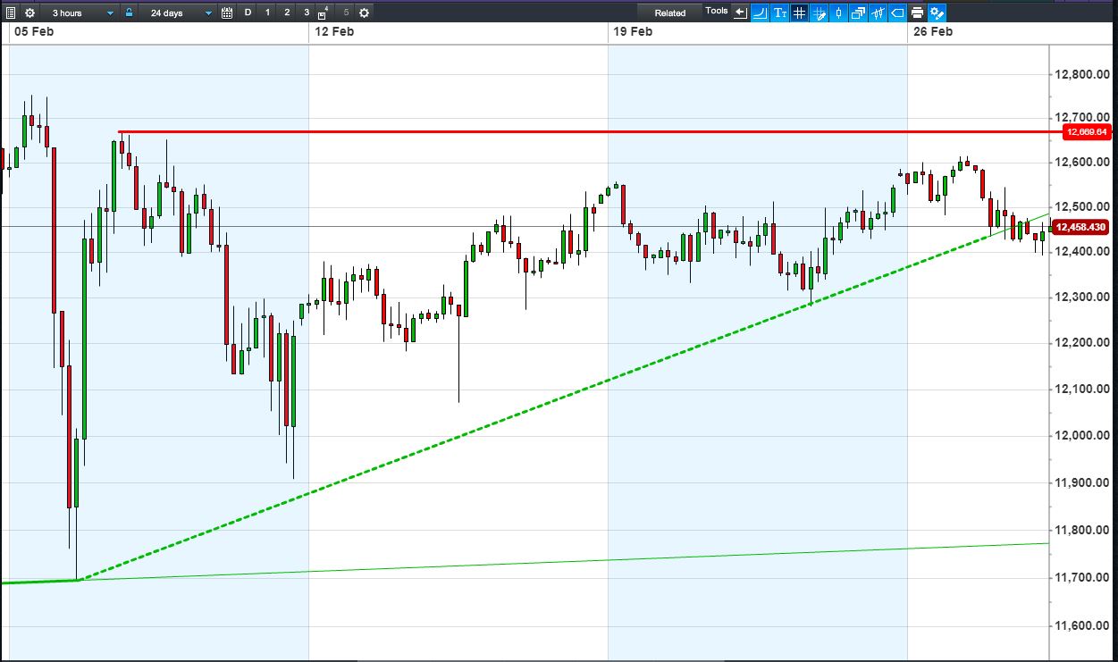 The DAX 30 has breached Feb rising support but bounced off 12400.