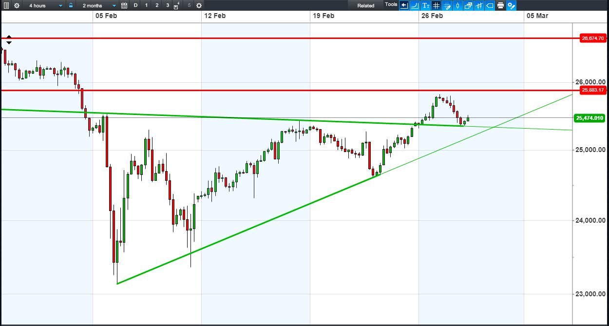 Dow Jones Futures have bounced off 25350 intersecting support to revisit 25500.