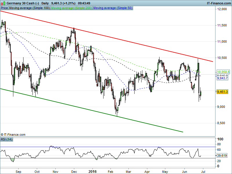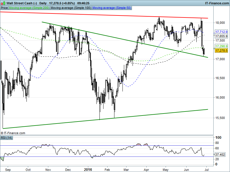 Wall Street/Dow Jones futures have again bounced from a new post-Brexit low and are currently up around resistance at the key 200-day moving average.