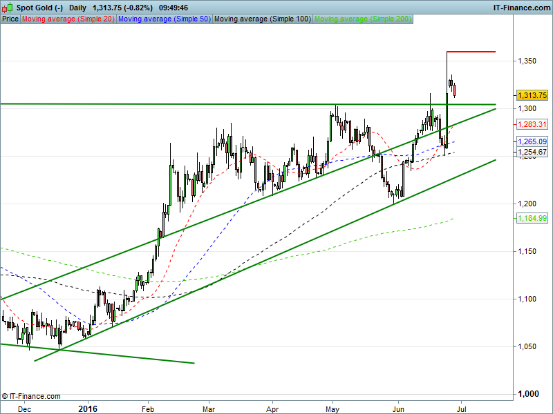 The UK 100 is back from a teasing bounce above 6100, already testing 6050 for support. The DAX30 has bounced from 9300 after a retrace from 9700 recovery highs. Wall Street/Dow Jones futures bounced from fresh post-Brexit lows of 17200 overnight but remain dogged by falling highs at 17300. Gold remains sideways around $1325, held close to post-Brexit highs as safe havens remain bid on Brexit uncertainty.