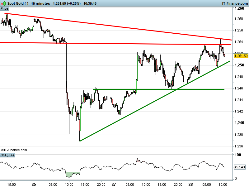 Gold has fallen back after failing to overcome resistance at $1253.5.