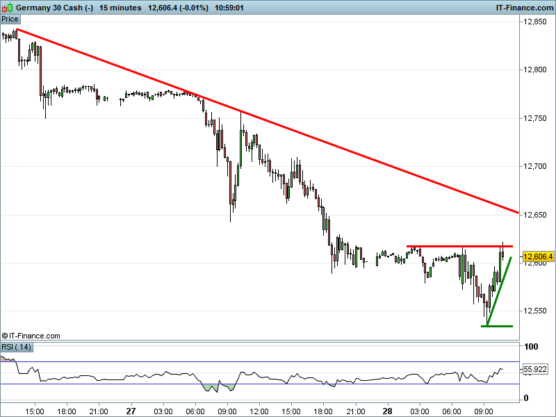 The DAX 30 has recovered from a test of support at 12550, however fails at 12620. Back to support?