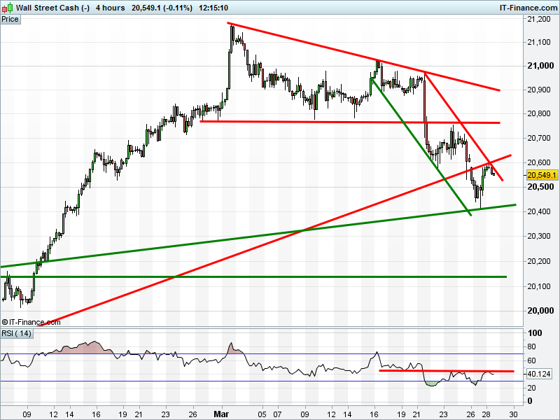 Dow Jones Futures have seen their rally turn back from 20600. New falling channel. RSI still oversold.