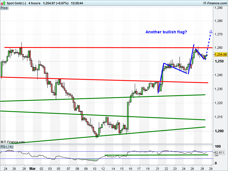 Gold back from $1260 highs, could be in the midst of another bullish flag that leads to a meaningful breakout. RSI holding bullishly