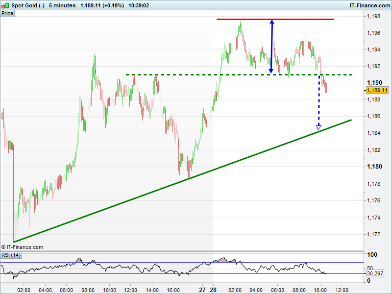 Gold has dropped back from rebound highs and broken below $1191 in what looks like be a bearish-double top back to rising support.