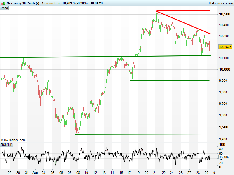 UK 100  bounced off our bearish watch level 6255 (see morning report). Can we regain 6300 before weekend? DAX30 off its recent key 10115 lows but yet to challange 6-day downtrend.  Wall Street/Dow Jones futures in a tight range 17800-17865. Bearish flag forming? Gold found resistance at March highs $1280 after rallying on weak USD and less risk appetite.