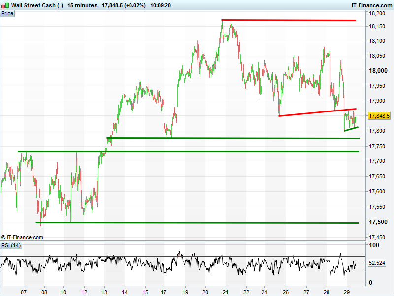 The Dow Jones has been trading a very tight range since late last night while the index decides on its next move. Could that be a bearish flag pattern forming, with downside to 17650?
