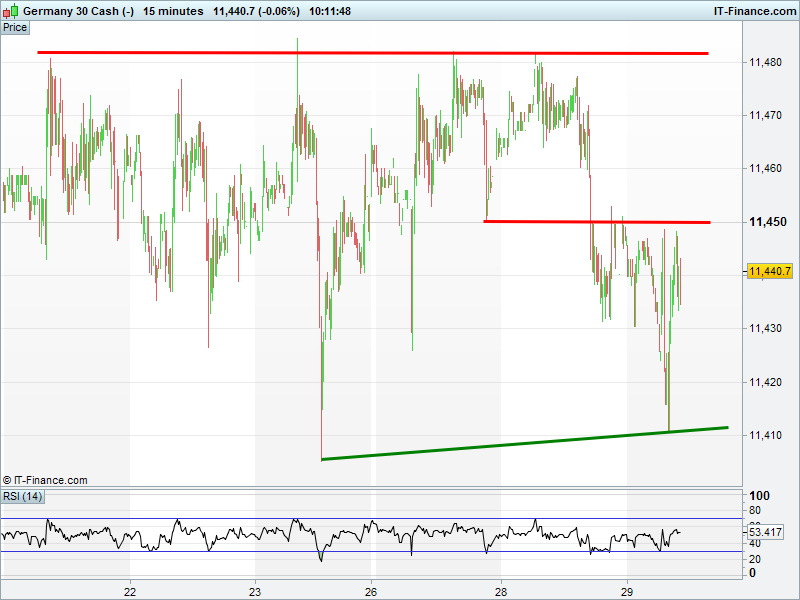 The DAX 30 has broken below 11450 which has since become resistance to keep it from recent highs.