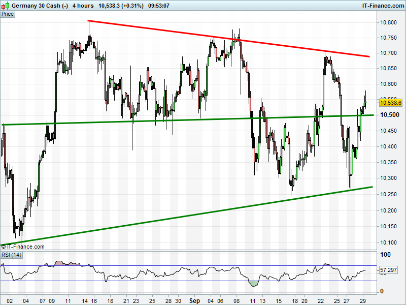 The DAX 30 is pausing around 10550 after an overnight bullish breakout above 10500 that puts it back in the upper half of its September trading range. Onwards and upwards?