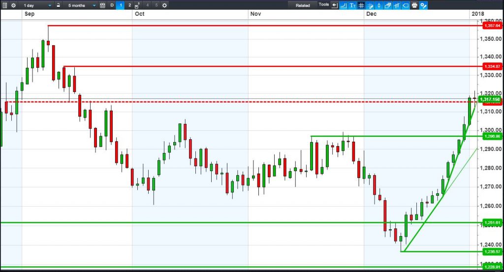 The UK Index 100 is holding its 7 Dec uptrend, with rising support at 7640. The DAX 30 is back from a challenge December falling highs resistance at 12950. Dow Jones Futures are trying to push back towards yesterday’s 24880 highs. Gold has made a bullish breakout above $1315.