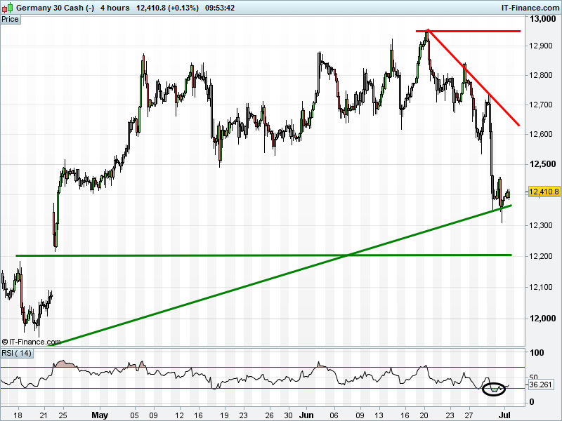 The DAX 30 is flat around 12400, still in a 7-month uptrend. RSI back from oversold. Bounce?