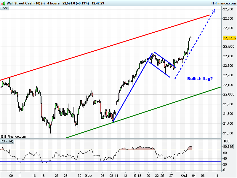 Dow Jones Futures look to be in the midst of a bullish flag to 22900, the ceiling of a 5-month up rising channel.