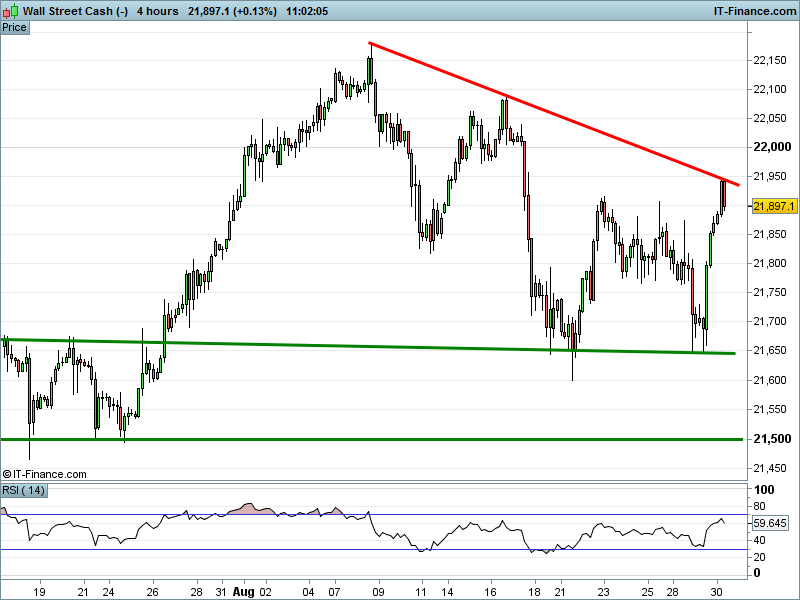 The UK Index 100 has broken below overnight lows of 7350 after failing to overcome 7380. Will it find its feet around 7350 or fall back to yesterday’s lows?