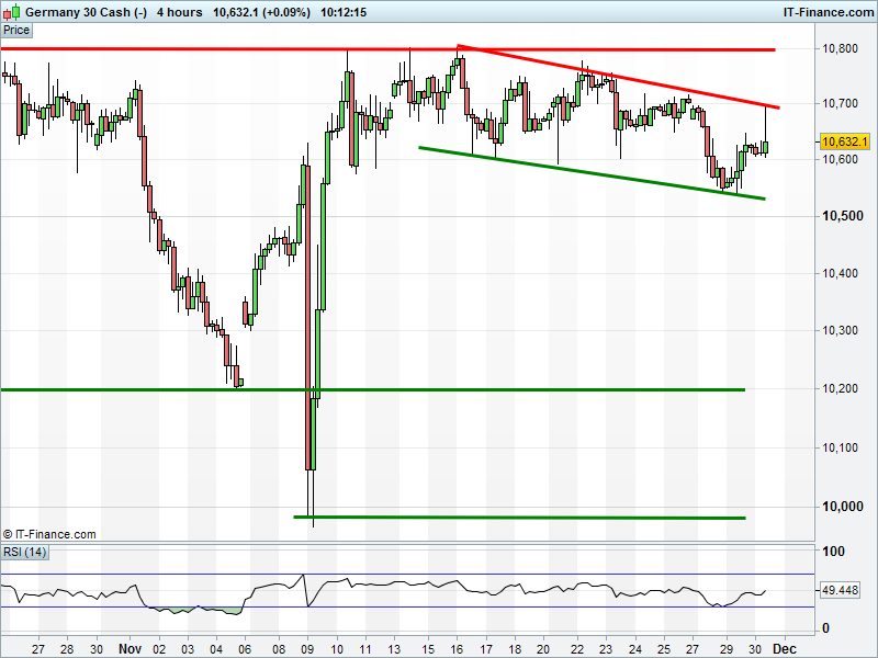 A failed DAX 30 rally leaves the index in a 2-week falling channel 10550-10700. Does today’s long upper wick mean a venture top the channel floor is on the cards?