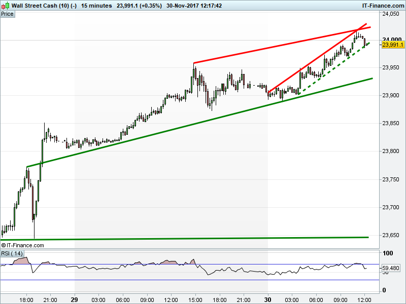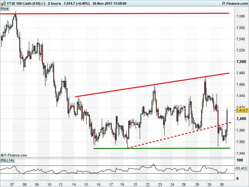 The UK Index 100 has bounced back above 7400. The DAX 30 has found fresh resistance at 13180. Dow Jones Futures are testing the floor of a 100pt rising channel. Gold has pulled back to rising support around $1280 .